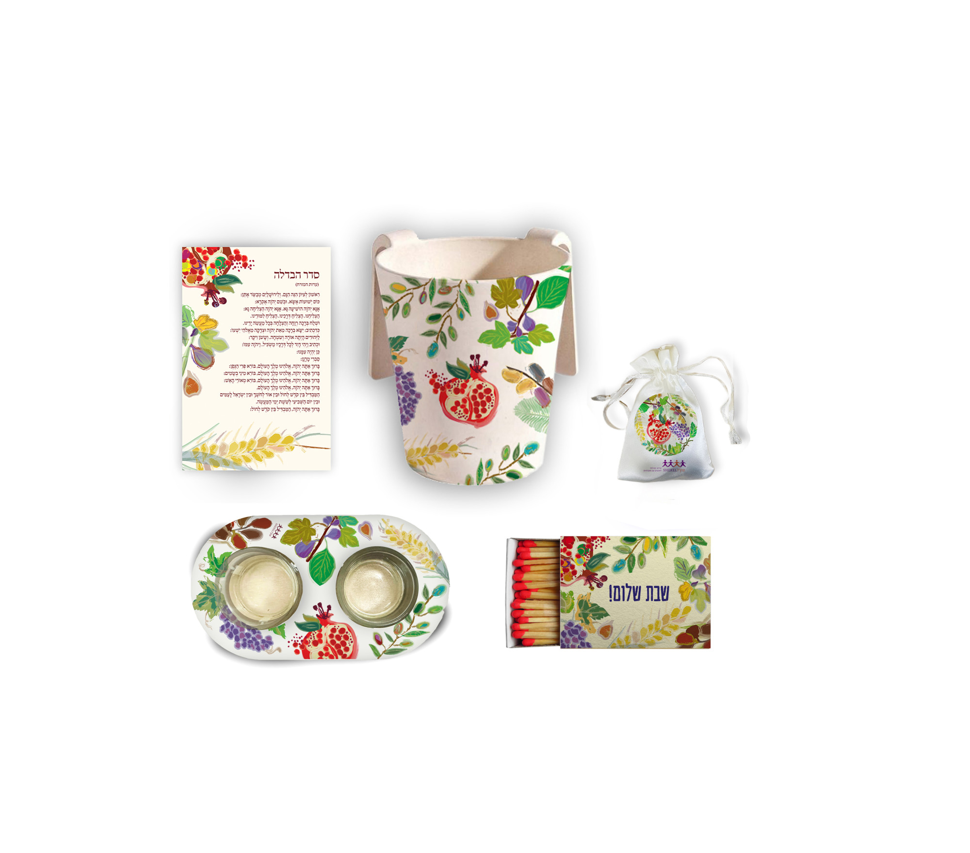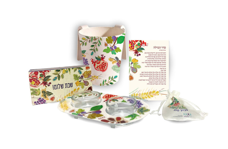 מארז אלגנטי, חגיגי ומלא משמעות – מתנה מושלמת לאירוח, לחגים, לשבתות חתן/כלה, לעובדים וליקרים לליבכם. כל פריט במארז מעוצב בציוריה הצבעוניים והמרהיבים של יפית ברוך, אמנית ירושלמית מוכשרת מצוות הסטודיו של שק"ל, אשר יצירותיה נושאות מסר של השראה, עוצמה ואופטימיות.